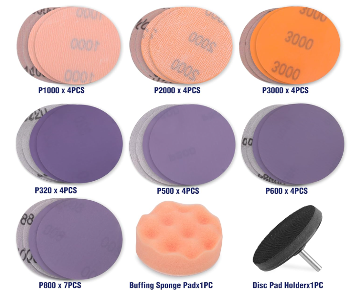 - 3" Purple Grit Sanding Discs: 4 × P320, 4 × P500, 4 × P600, 4 × P800